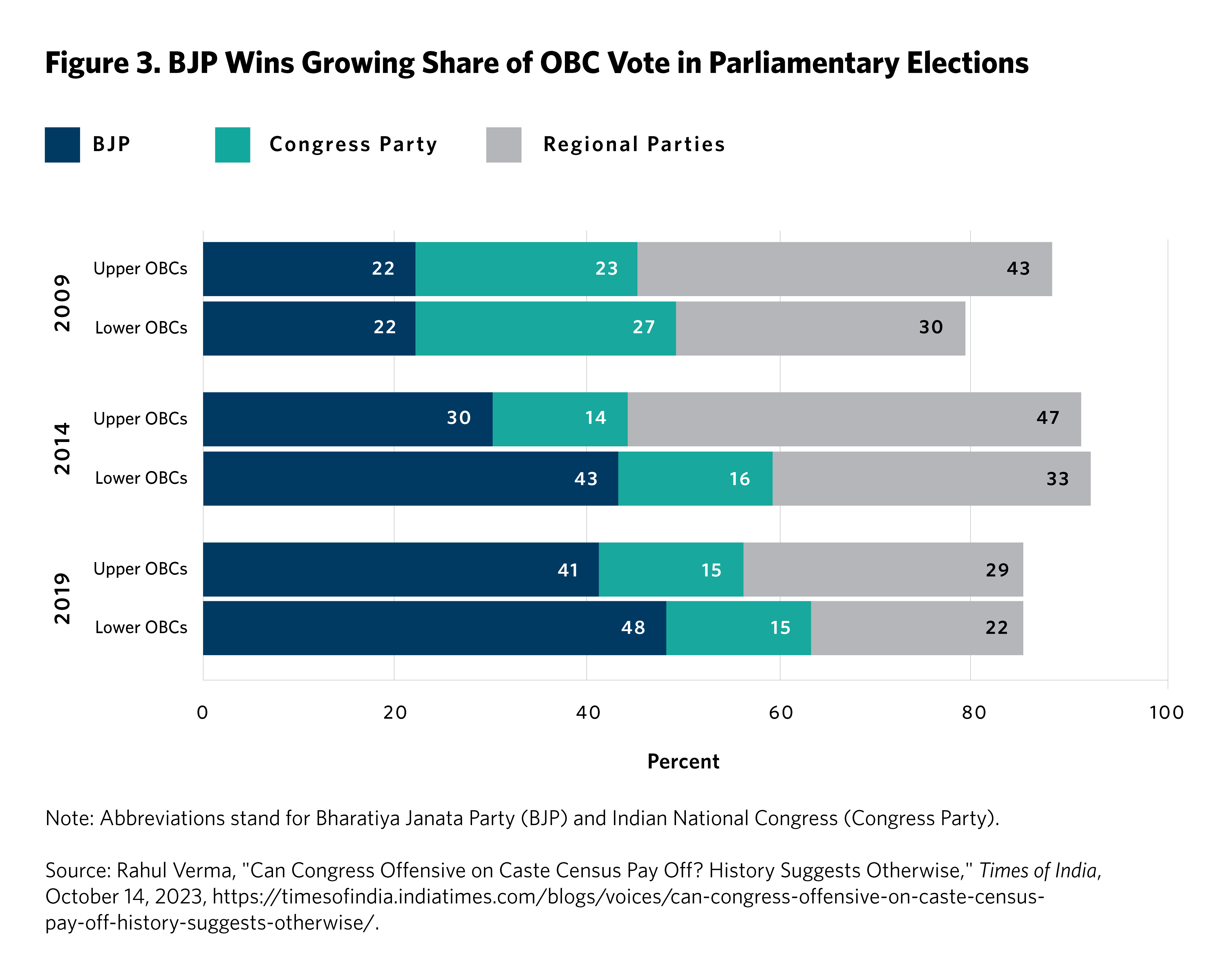 In particular, the BJP positioned itself as the champion of jatis (subcastes) located among the lower rungs of the OBC community. These deprived groups, referred to as Extremely Backward Classes (EBCs) or Lower OBCs, did not necessarily reap the benefits promised by the Mandal mobilization, with most of the visible benefits accruing to a handful of dominant jatis. The BJP’s bet paid off big in 2014. While the party captured 30 percent of the OBC vote, it earned 43 percent of the EBC vote. In 2019, it increased its gains among both groups, winning 41 percent of the OBC vote and 48 percent of the EBC vote. The share of the backward vote flowing to the Congress Party and once-dominant regional parties declined precipitously in turn.